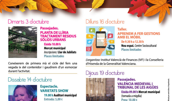 Los interesados en participar en esta actividad organizada por el Ayuntamiento de l’Eliana deberán retirar las invitaciones gratuitas en el Hogar de los Jubilados desde hoy sábado 25 hasta el viernes 1 de octubre en horario de 10.30 a 13 horas y de 17 a 20 horas (excepto lunes).