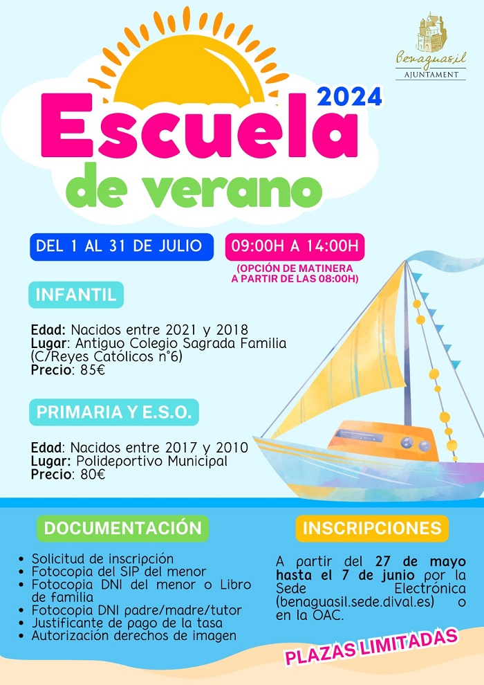 L’escola d’estiu que, es desenvoluparà de l’1 al 31 de juliol en horari de 9 a 14 horas, s’impartirà en el poliesportiu municipal de Benaguasil i en l’antic col·legi de la Sagrada Família.