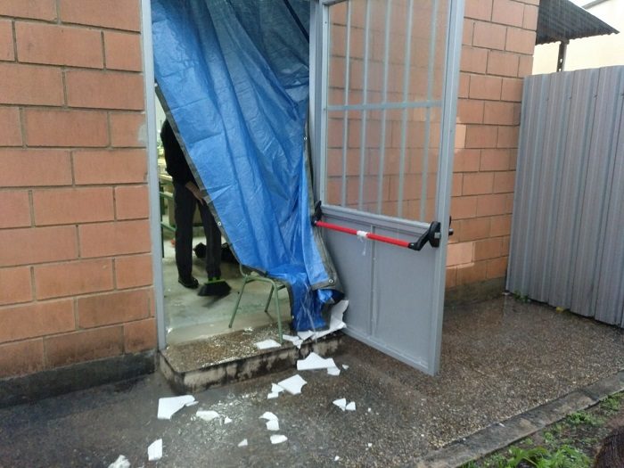 Ante la cantidad de agua, los responsables del centro de Secundaria optaron por romper una parte del pladur para drenar el falso techo y que no se derrumbara. Al mismo tiempo, colocaron una lona para canalizar el agua y con la ayuda de escobas la empujaron hacia exterior a través de la nueva puerta de emergencia.