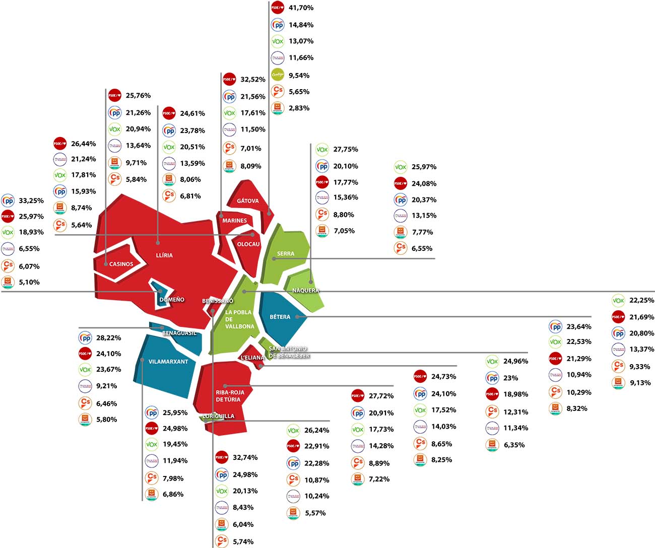 Respecto al mes de abril, el partido más votado continúa siendo el PSOE, que mantiene los resultados cosechados en la anterior cita con las urnas. Los socialistas suman ocho municipios. Han vuelto a ganar donde ya gobiernan en los ayuntamientos como l‘Eliana, Riba-roja de Túria, Llíria, Marines, Benissanó y Olocau. También continúa siendo el partido más votado en Gátova, donde ha obtenido el mejor resultado con el 41% de los votos, y en Casinos, donde gobierna Compromís.