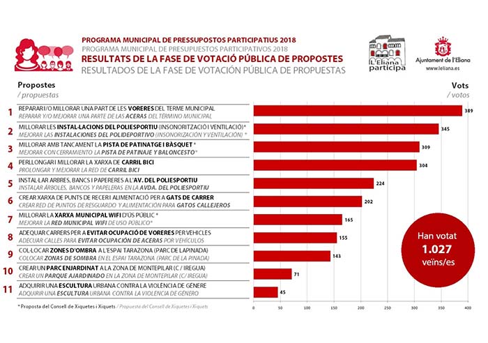 El pasado 4 de noviembre se cerró el periodo de votación pública de las propuestas seleccionadas del Programa Municipal de Presupuestos Participativos, unas propuestas que surgen de los vecinos de l’Eliana para que el Ayuntamiento las implemente en el municipio a lo largo del 2019.