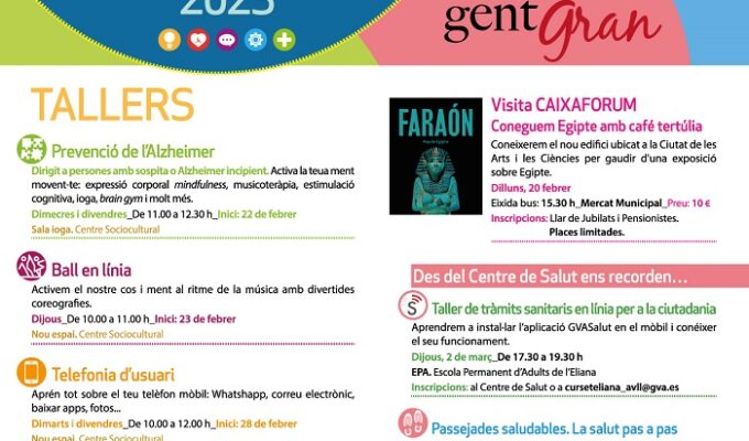 El jueves 19 de septiembre tendrá lugar una actividad divulgativa con la charla ‘Adelántate al Alzheimer: para qué, cuándo y cómo? Aspectos legales a tener en cuenta’en la Escuela de Adultos a las 18 horas y participarán José Vicente Gimeno Crespo, abogado y vicepresidente de la Sección de Derecho y Discapacidad del Colegio de Abogados (ICAV), y César Belda Casanova, notario exdecano del Colegio Notarial de Valencia.