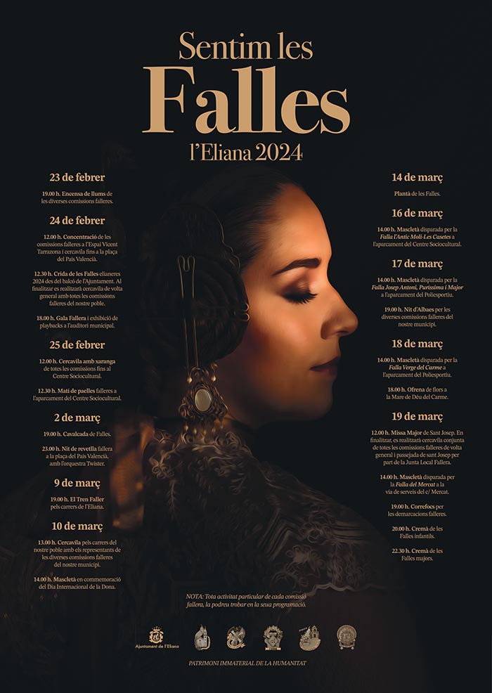 Els carrers de l’Eliana tornaran a vibrar els dies 16, 17, 18 i 19 de març a les 14:00 amb l’olor de pólvora de les mascletaes disparades per cadascuna de les comissions falleres de la localitat. Els tradicionals actes com les albaes recorrent totes les comissions o l’Ofrena a la Mare de Déu del Carme no faltaran les vesprades del 17 i 18 de març.