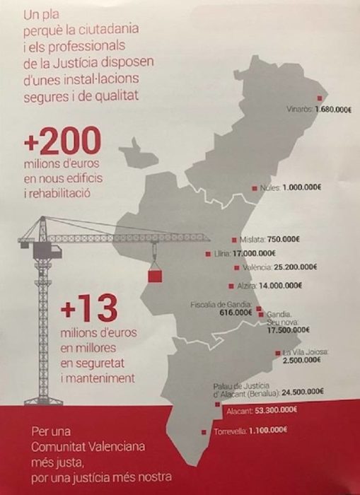 está en el mapa del nuevo plan de Infraestructuras Judiciales 2018-2021 dotado con 200 millones de euros y un horizonte hasta el año 2021 y que ha presentado hoy la consellera de Justicia, Gabriela Bravo, en el Palau de la Generalitat.