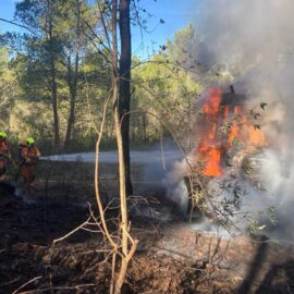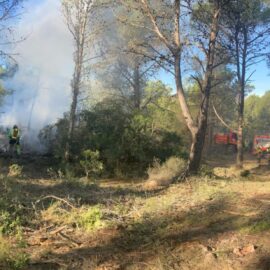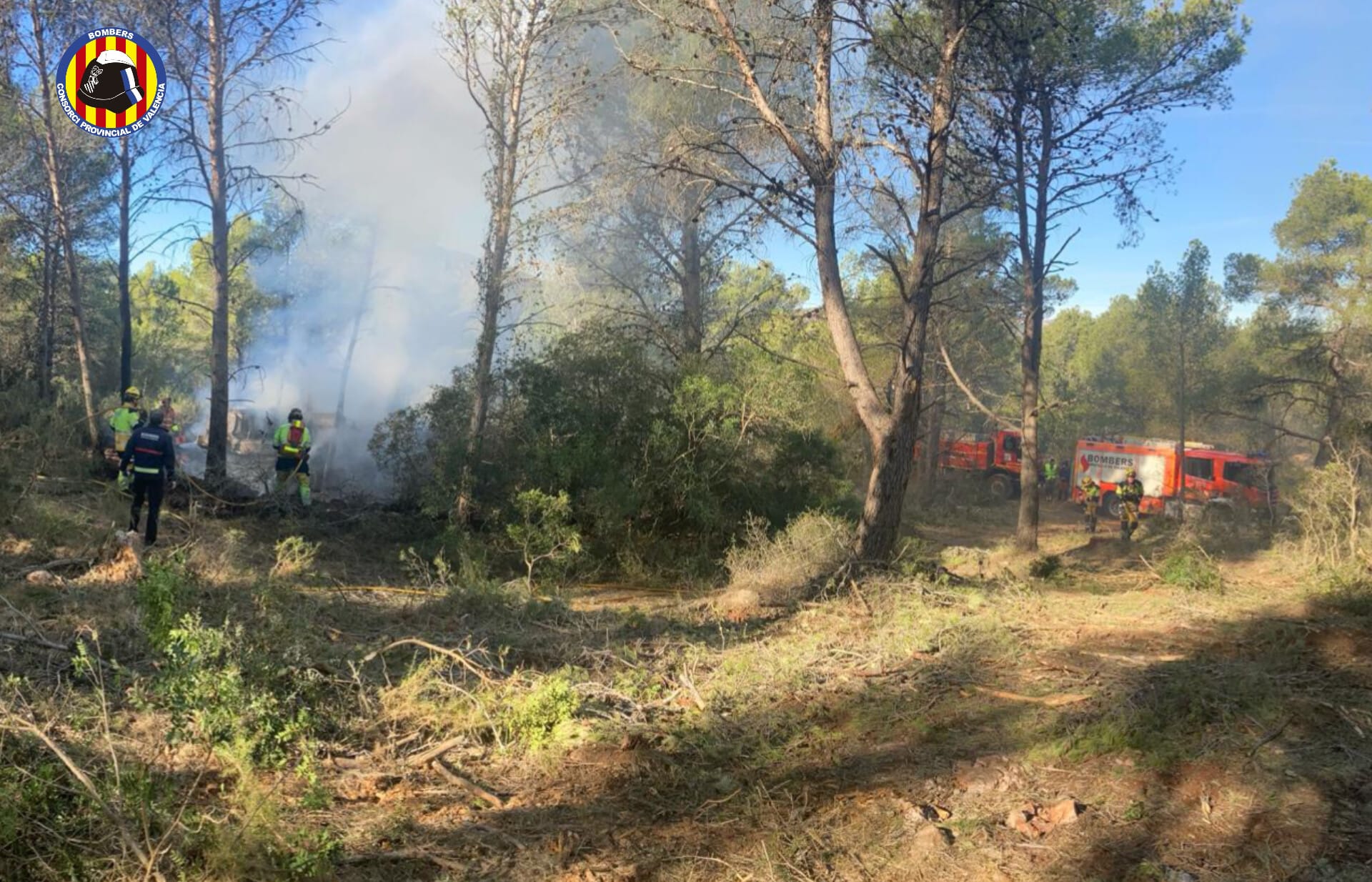 El bombers i sergent de Sagunt, brigades forestals del Consorci, coordinador forestal del Consorci, i bombers forestals de GVA segueixen treballant per acabar d’extingir l’incendi.